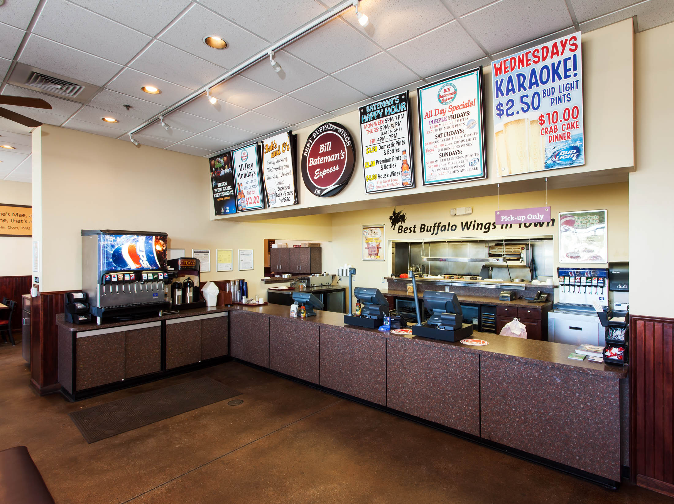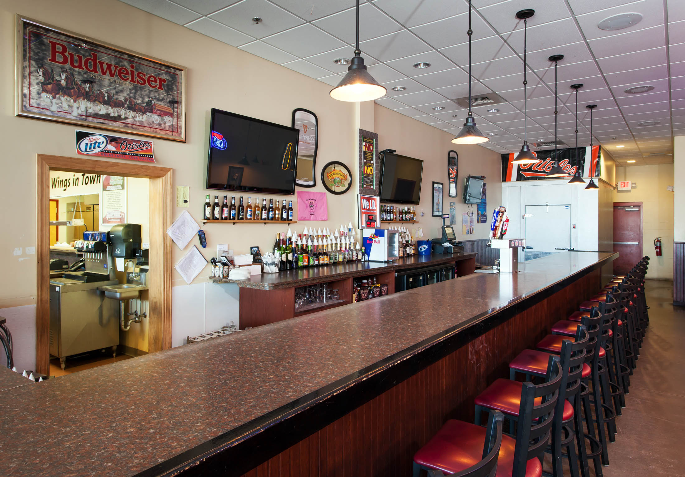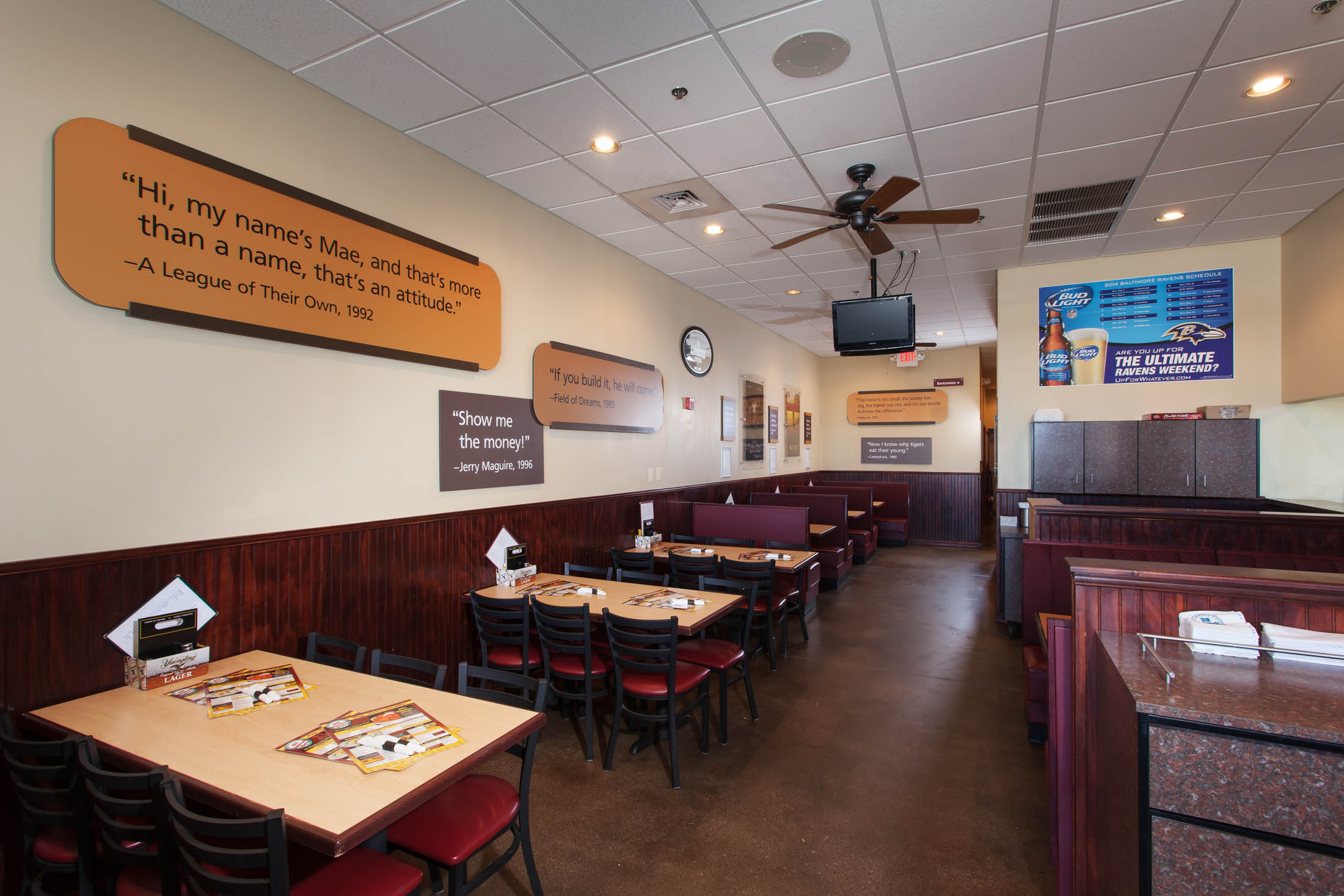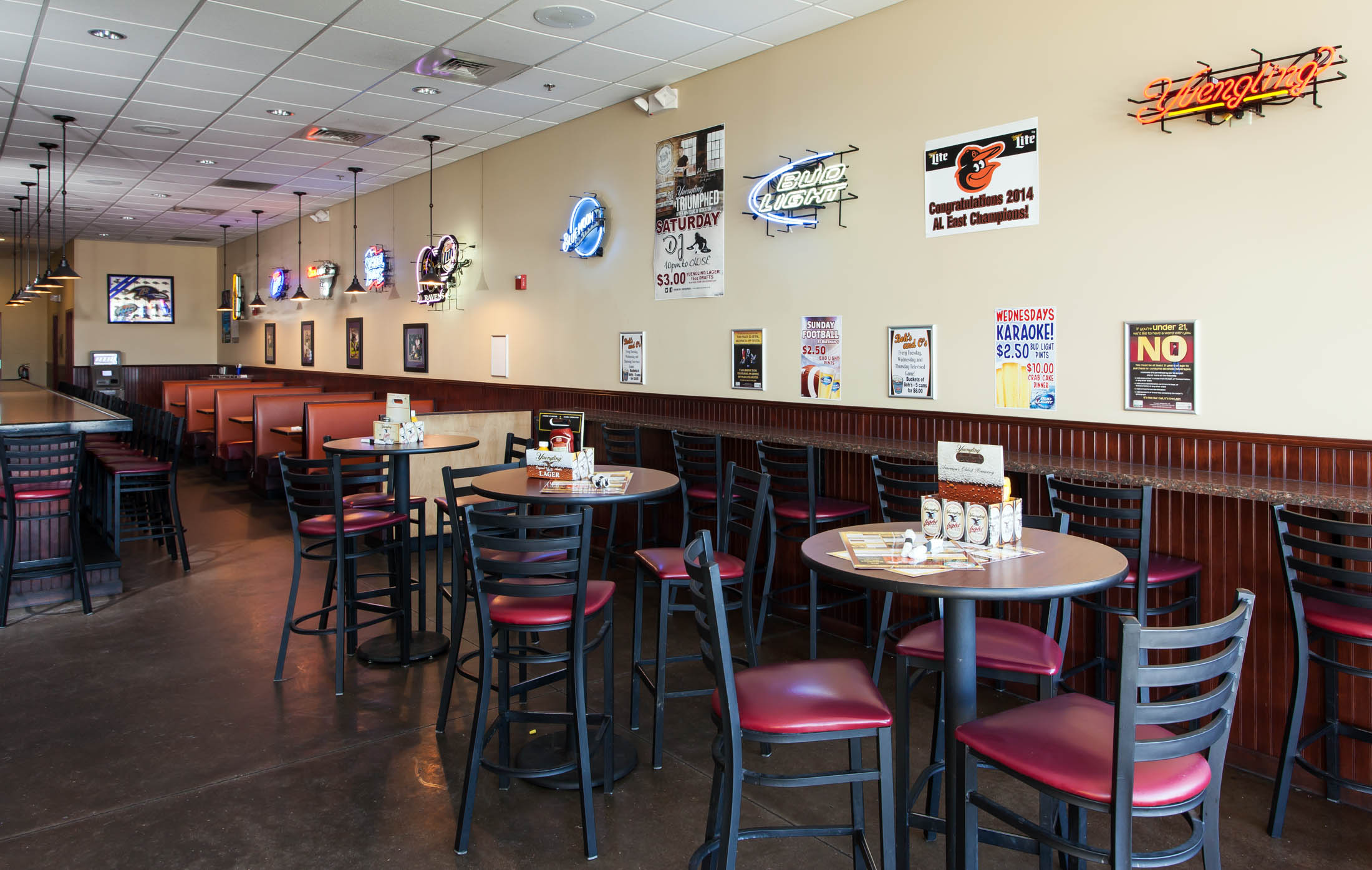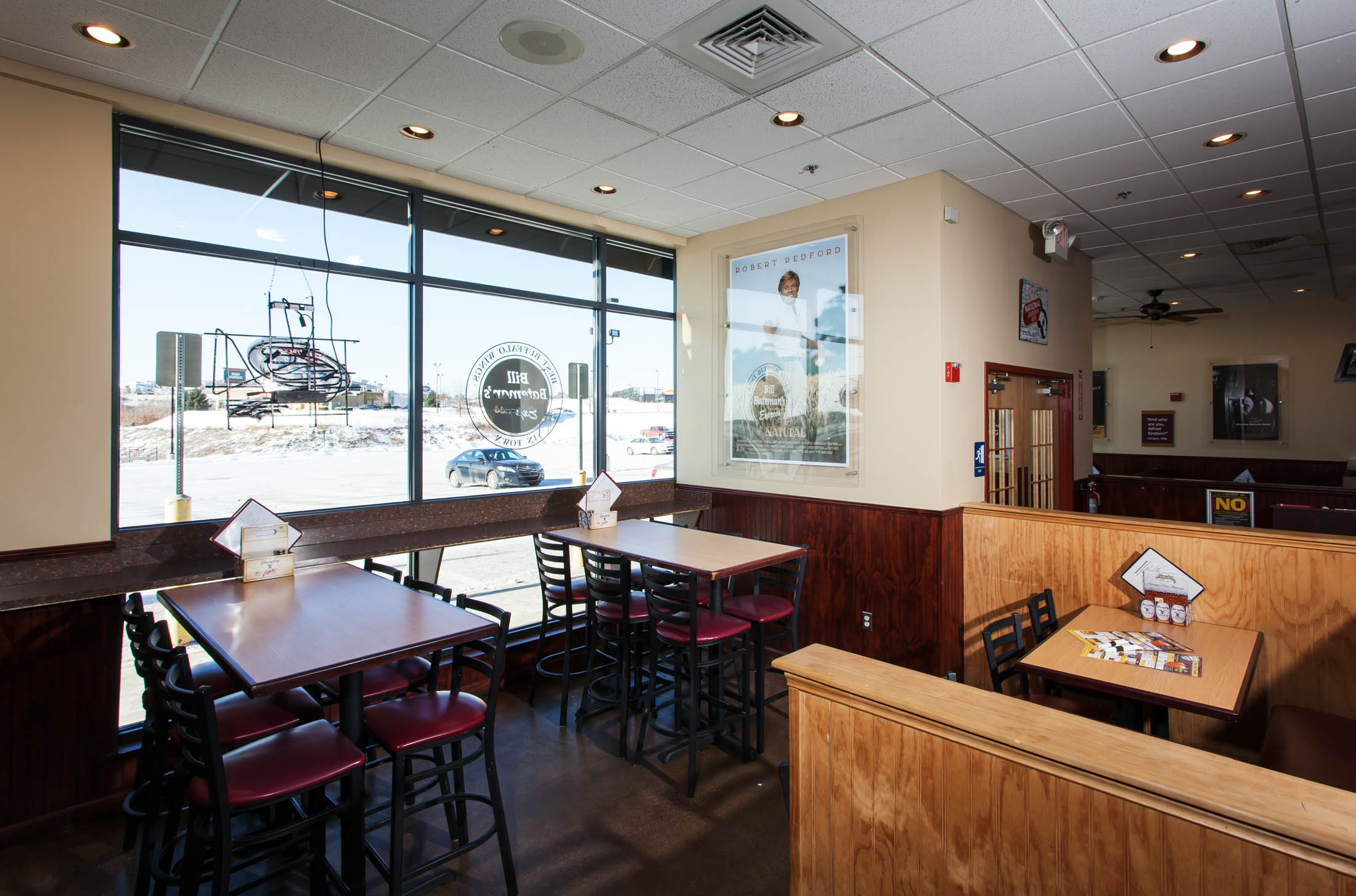 This new restaurant includes a commercial kitchen, walk-up ordering counters, and a bar with 15 seating capacity. The dining area contains high and low top tables and booth seating.
