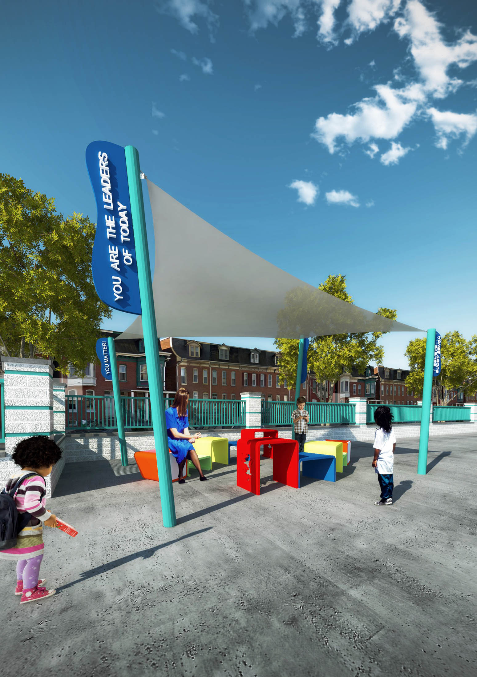 CORE saw a good opportunity to bring schools, local government and businesses together to expand Buddy Benches. They reached out to state Rep. Kevin Schreiber, who put them in touch with the charter school. CORE representatives visited the school to teach them about tools in the architectural industry and talk about different bench designs. Students came up with their own ideas, and CORE worked pieces of those into three possibilities. The colorful final design includes seating of different heights with a canopy.