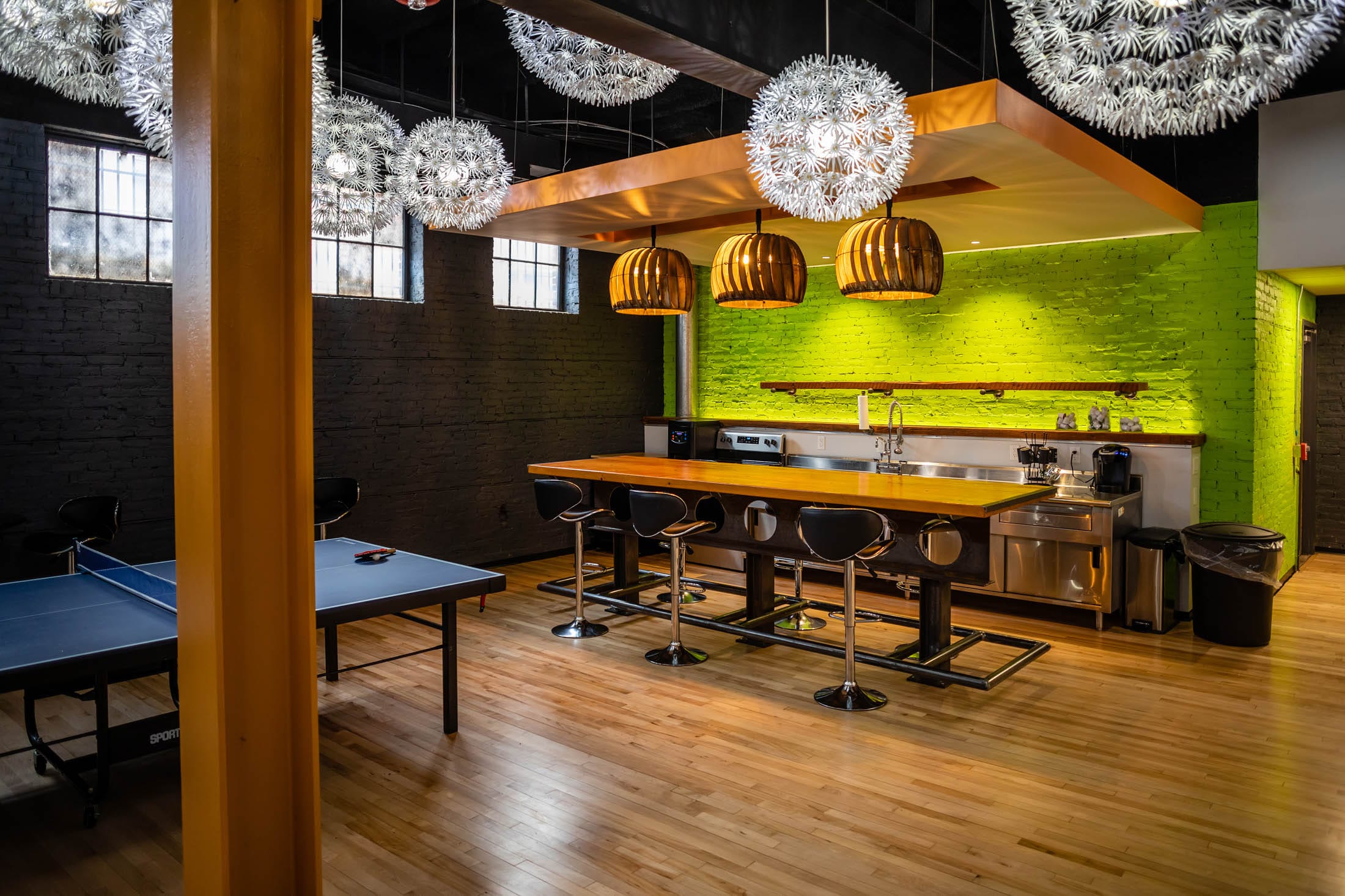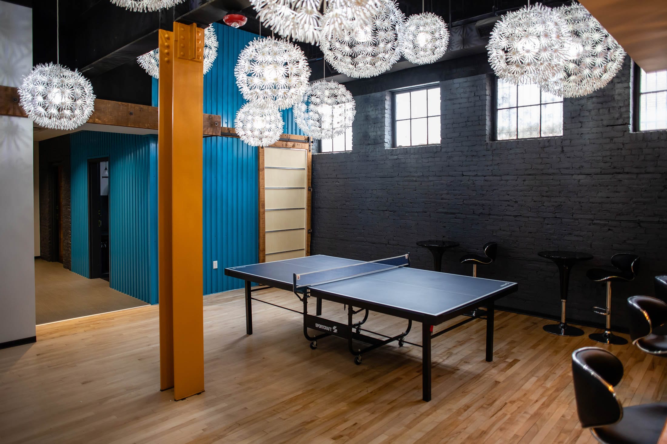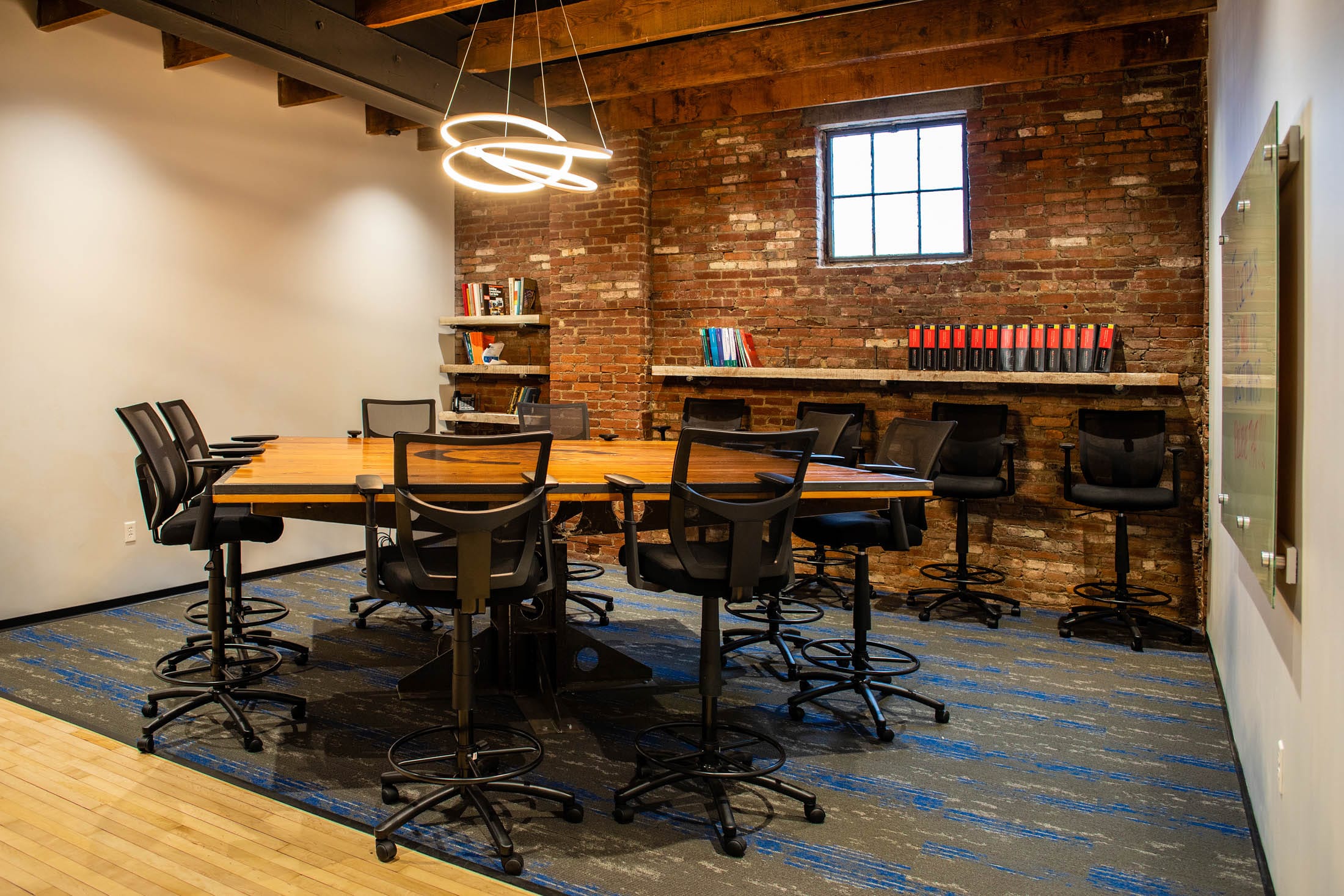 CULTURE OF COLLABORATION. A main goal for our headquarters was to maintain CORE’s “family” culture – with a family considerably larger than it once was. A big kitchen with a 22-foot standing-height table and TV provides space for meals, events, and all-hands meetings. Conference rooms of various sizes allow teams to work together more efficiently and spontaneously.
