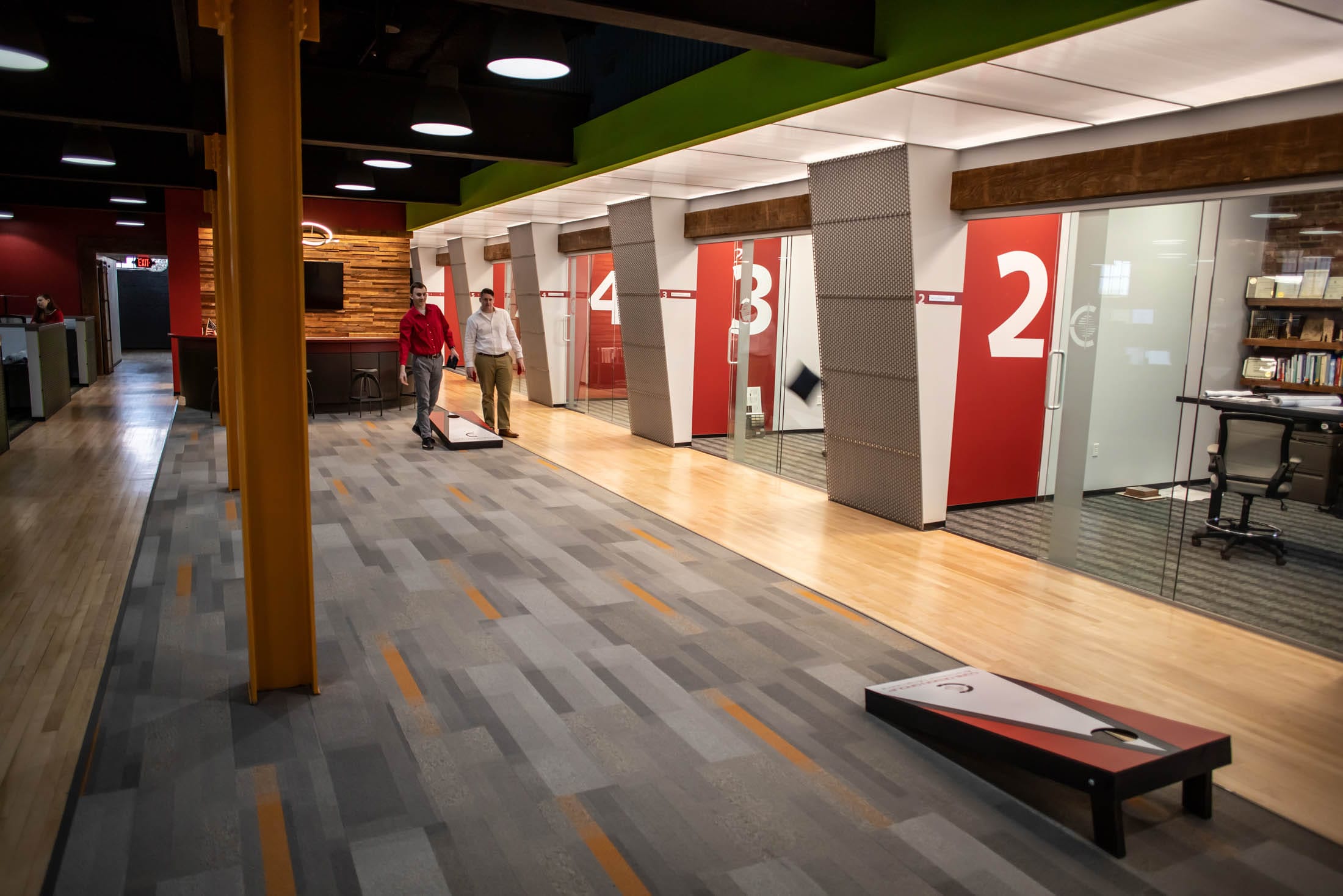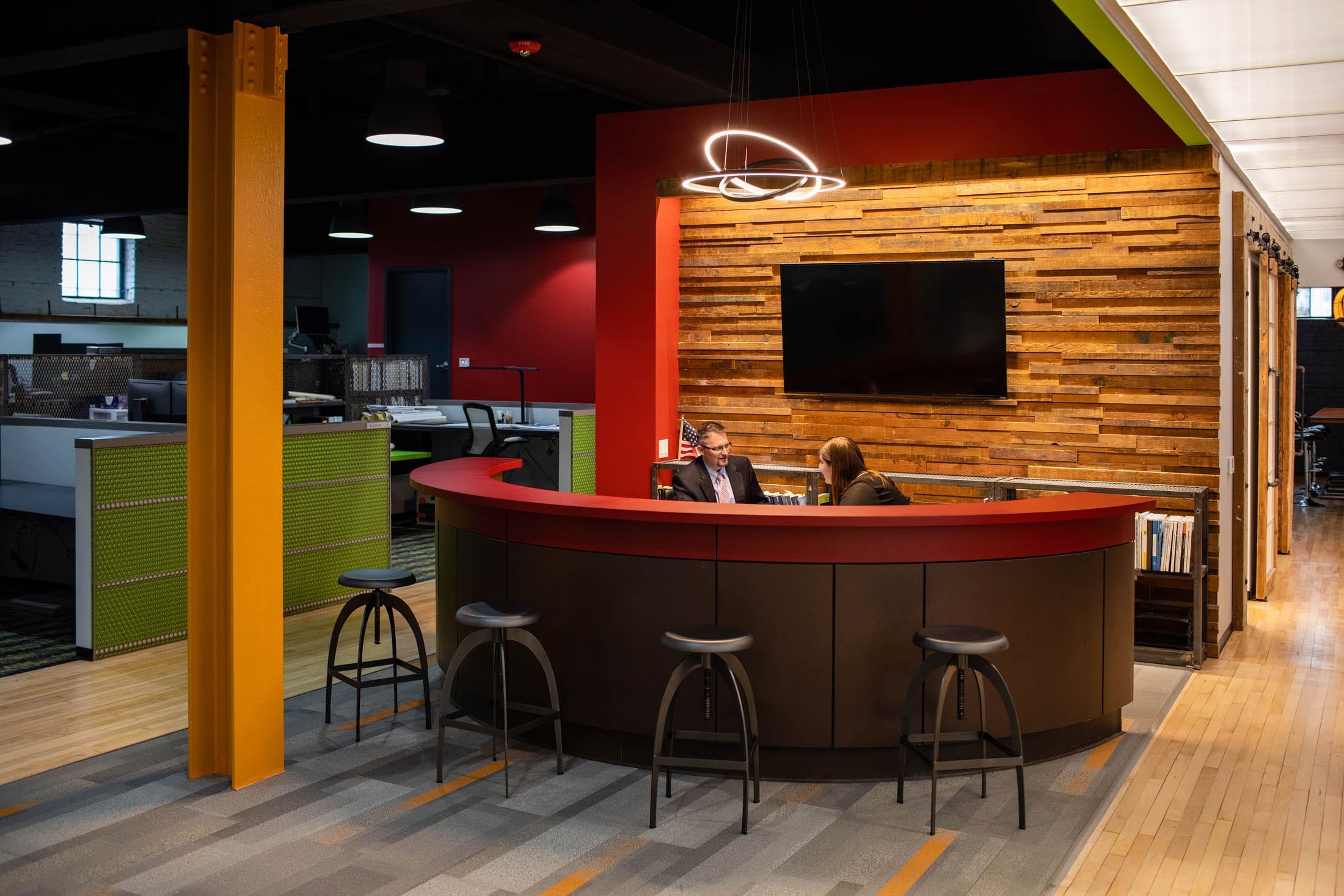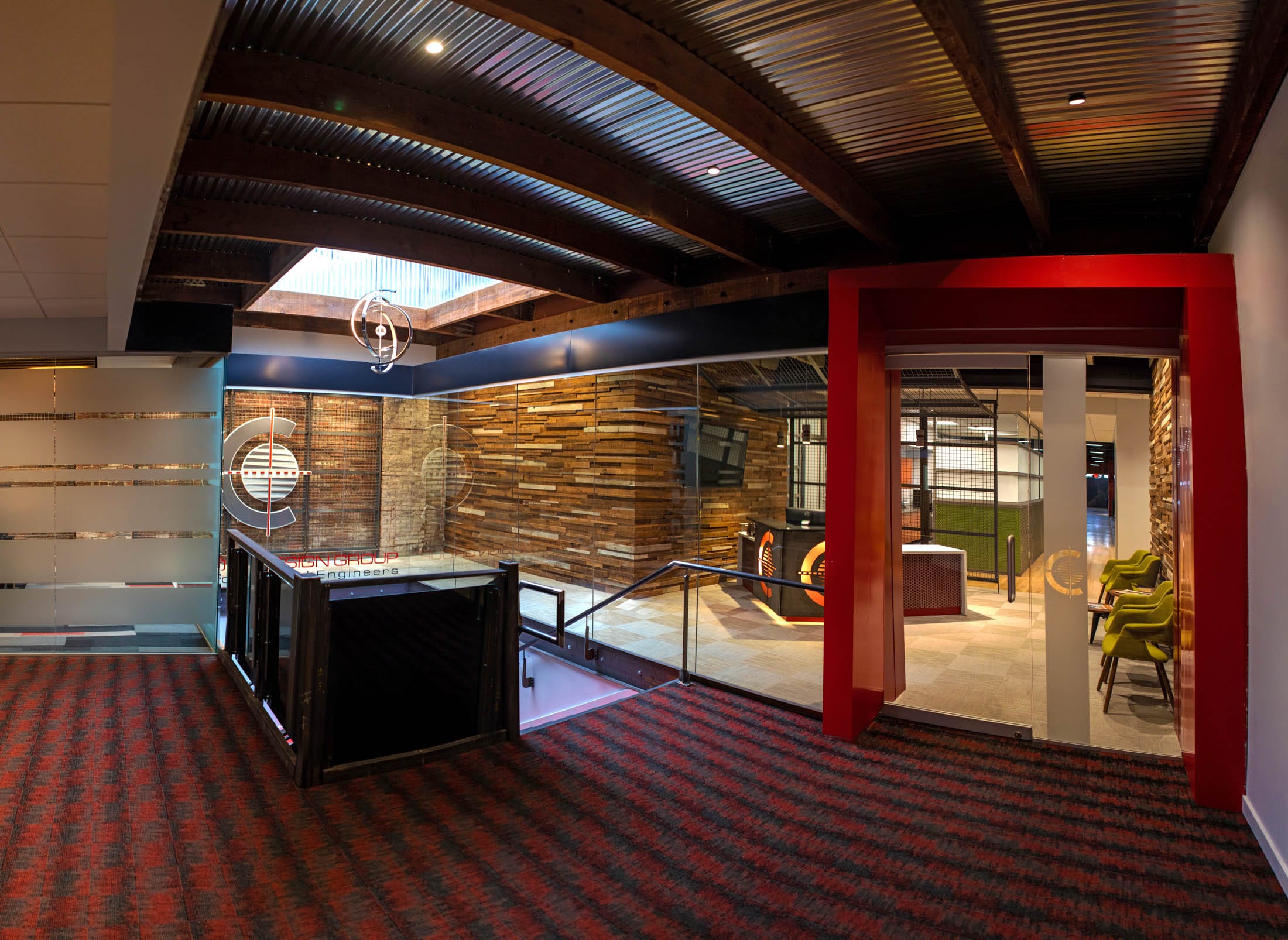 BRINGING IT ALL TOGETHER. The post-modern office provides our growing team with all the necessities and a few grace notes too: a skylight brings the sun into our two-story stair tower, lighting the path to our red entrance arch signifying you’ve arrived.