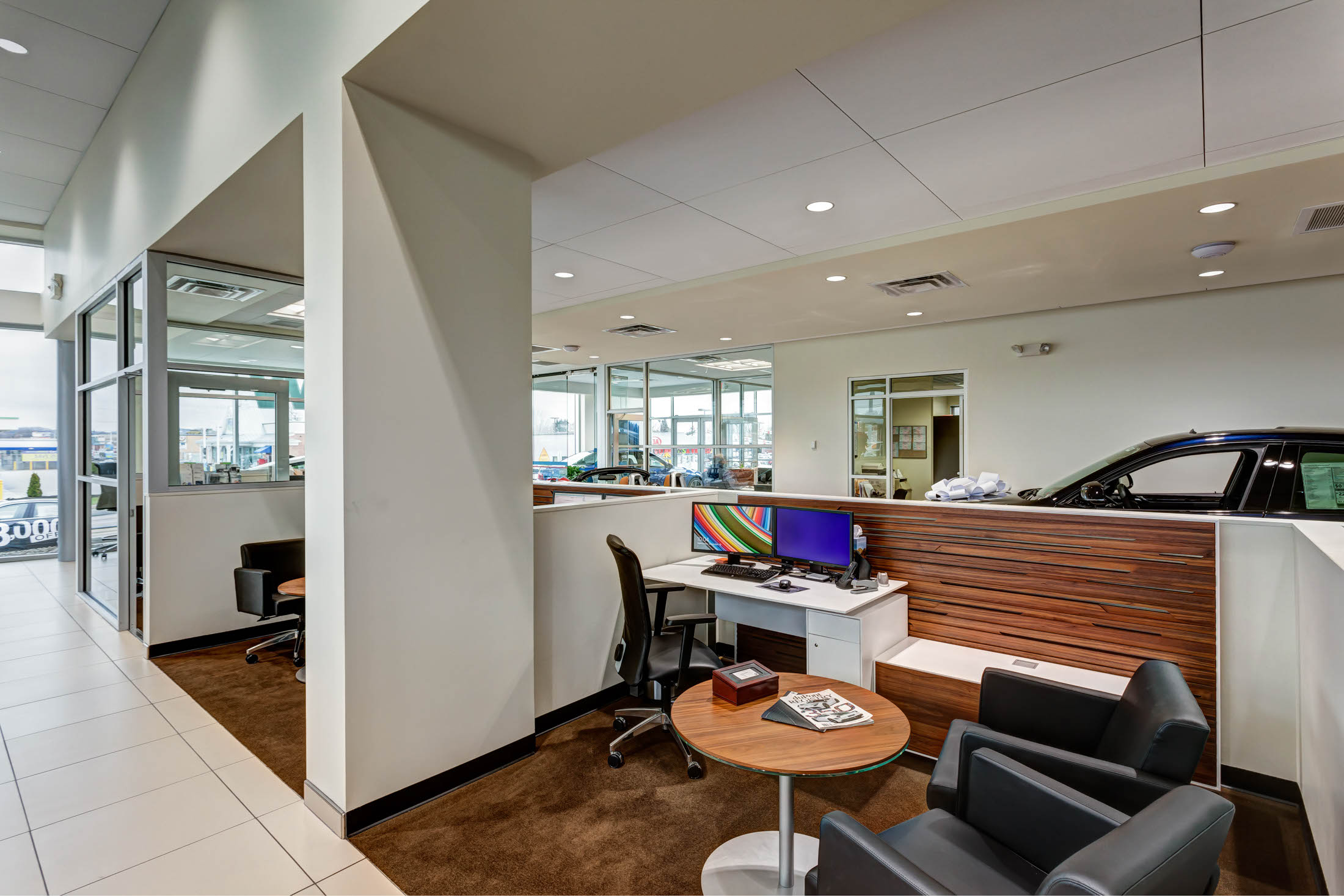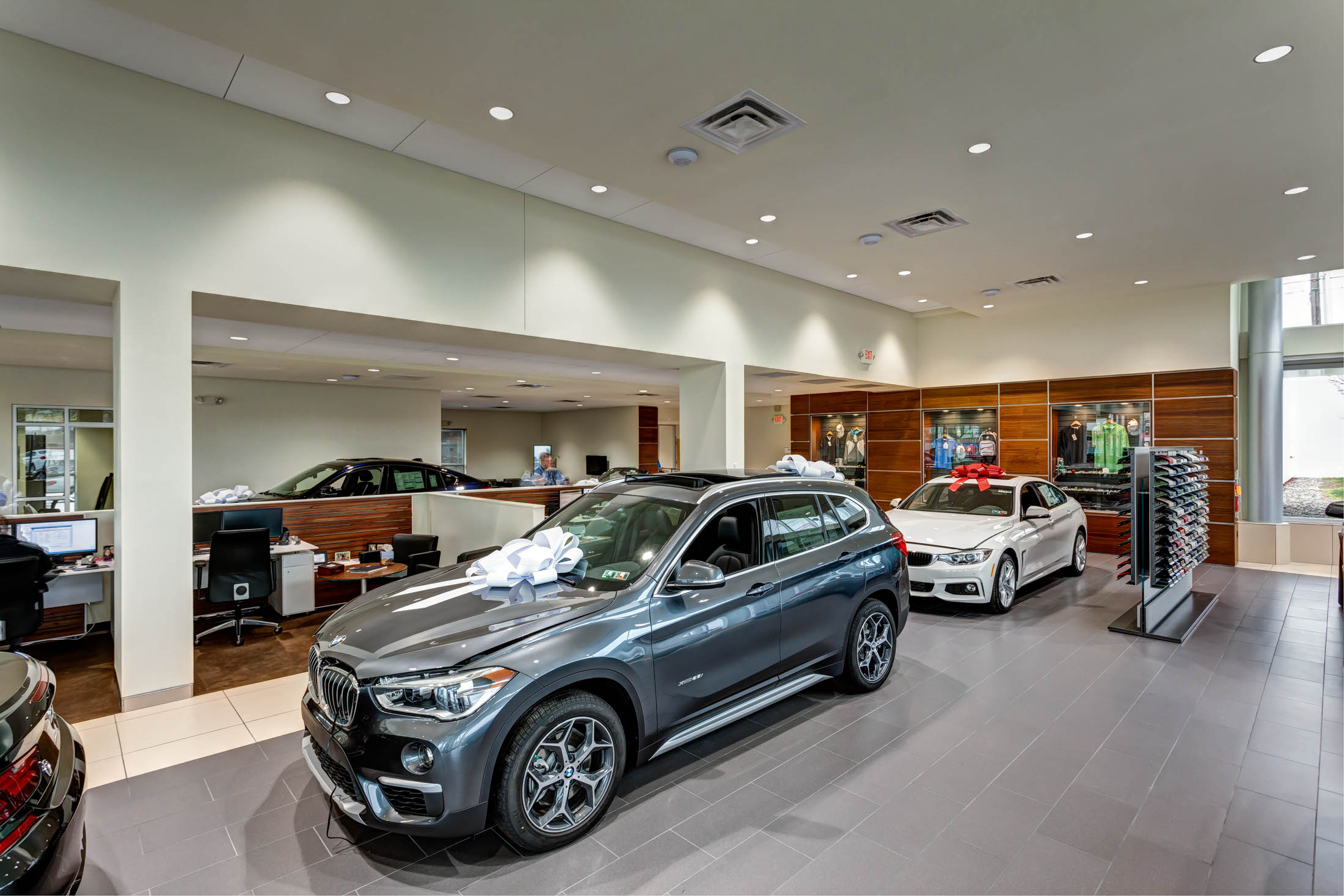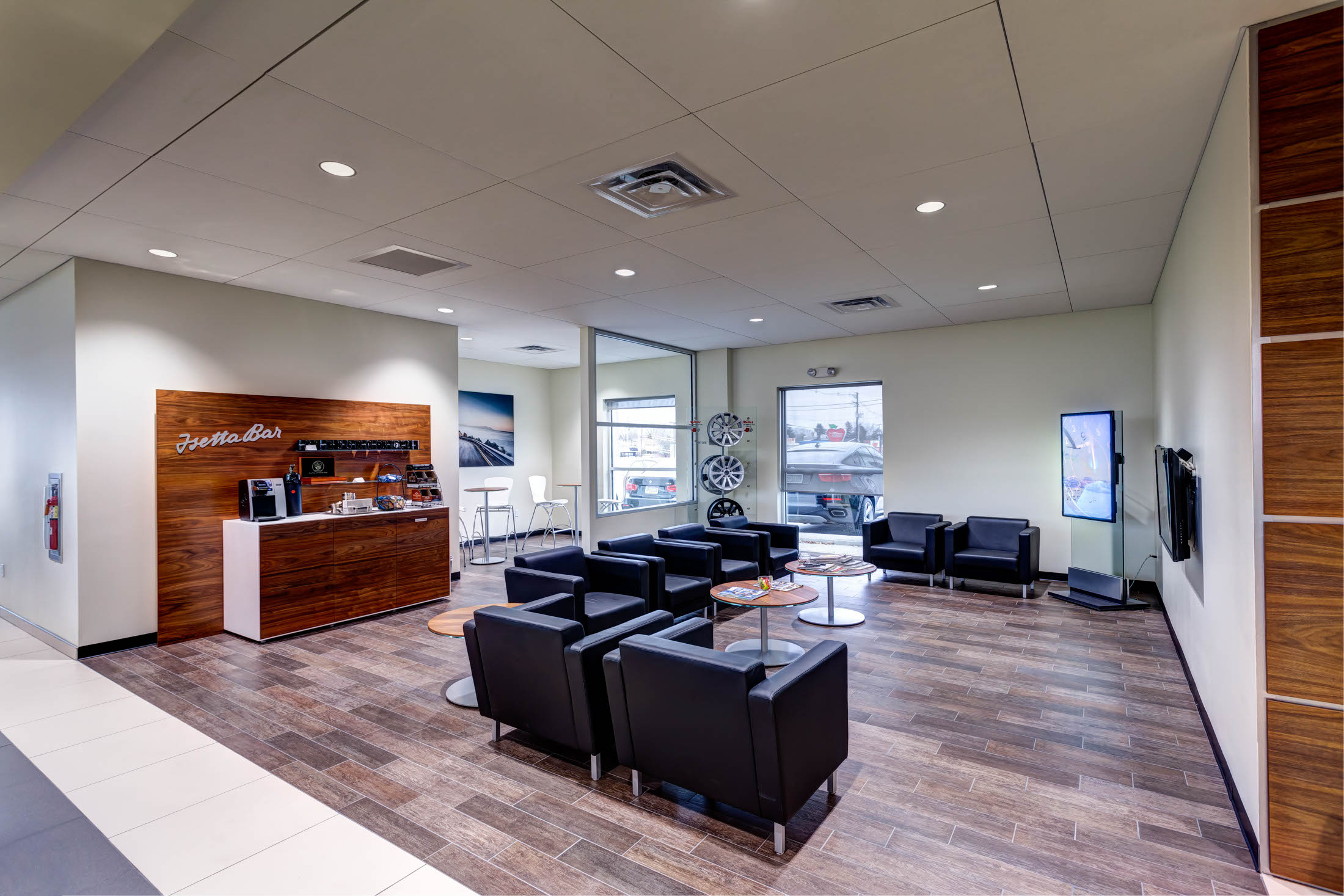 The renovation project included the design and reconfiguration of the interior layout and upgrades to the interior finishes throughout the service center to bring it to BMW imaging standards. The aluminum exterior was finished with Dryvit and the exterior also received an all-new exterior facade with a multilevel entrance canopy and a new front vestibule to update the look of the dealership.