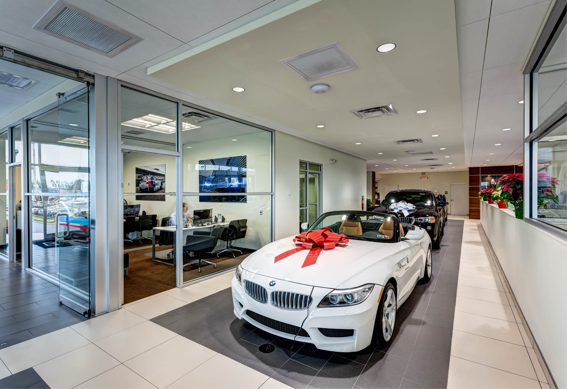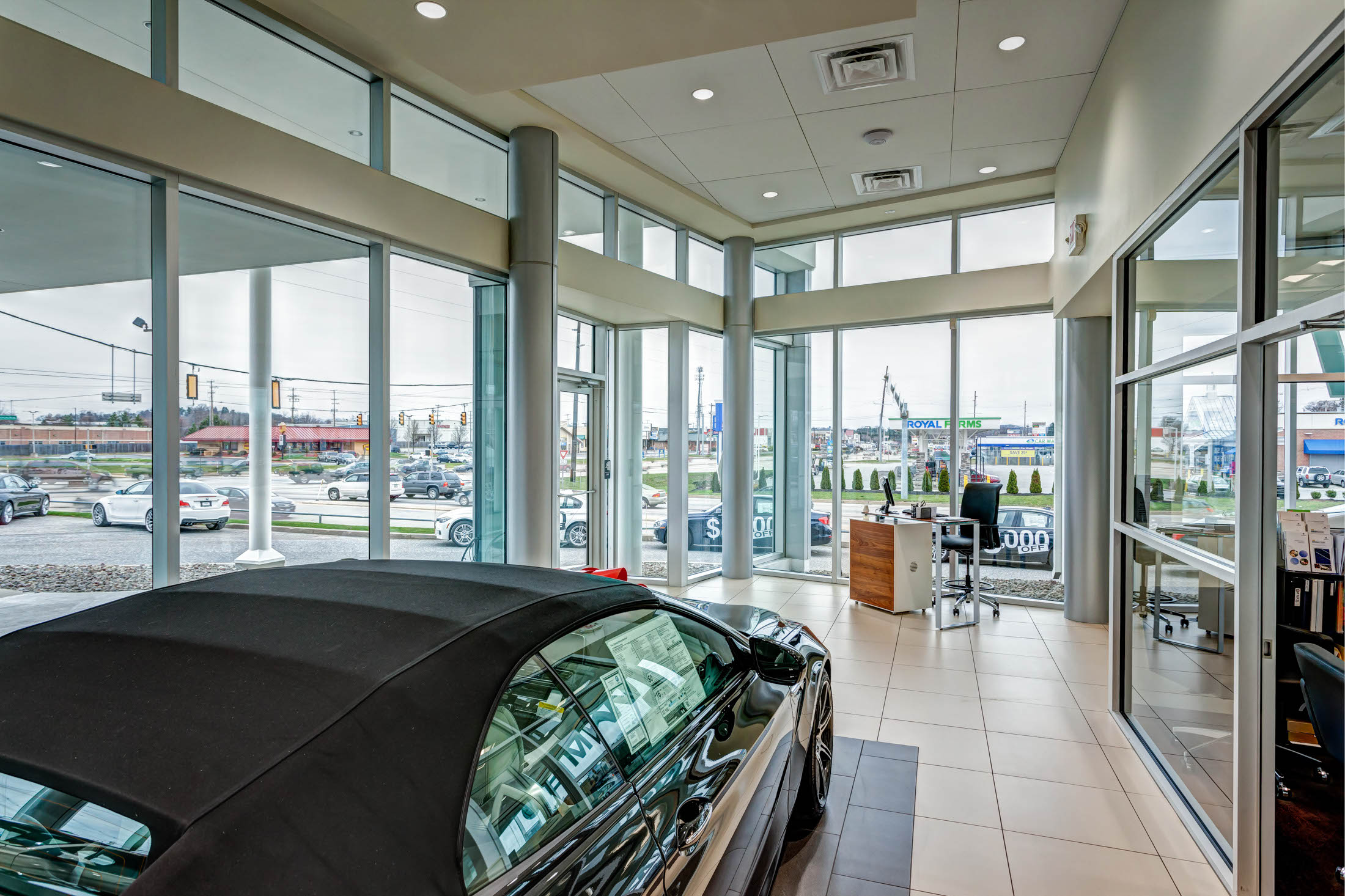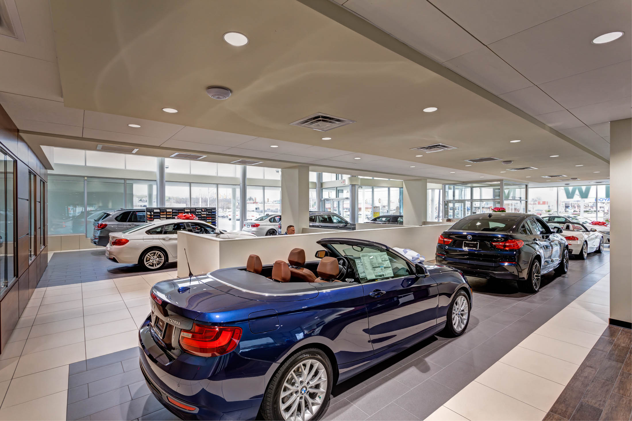 The renovation project included the design and reconfiguration of the interior layout and upgrades to the interior finishes throughout the service center to bring it to BMW imaging standards. The aluminum exterior was finished with Dryvit and the exterior also received an all-new exterior facade with a multilevel entrance canopy and a new front vestibule to update the look of the dealership.