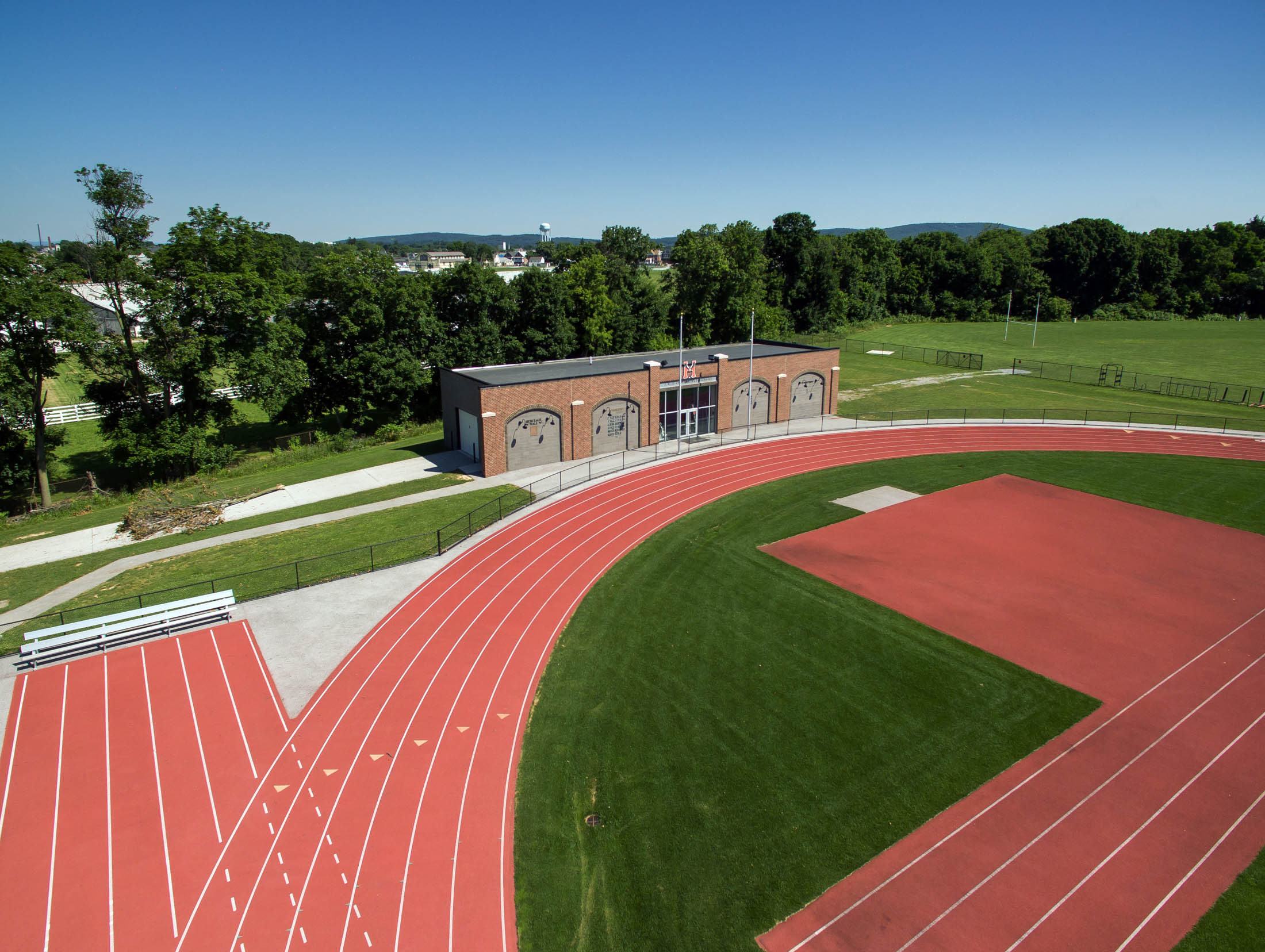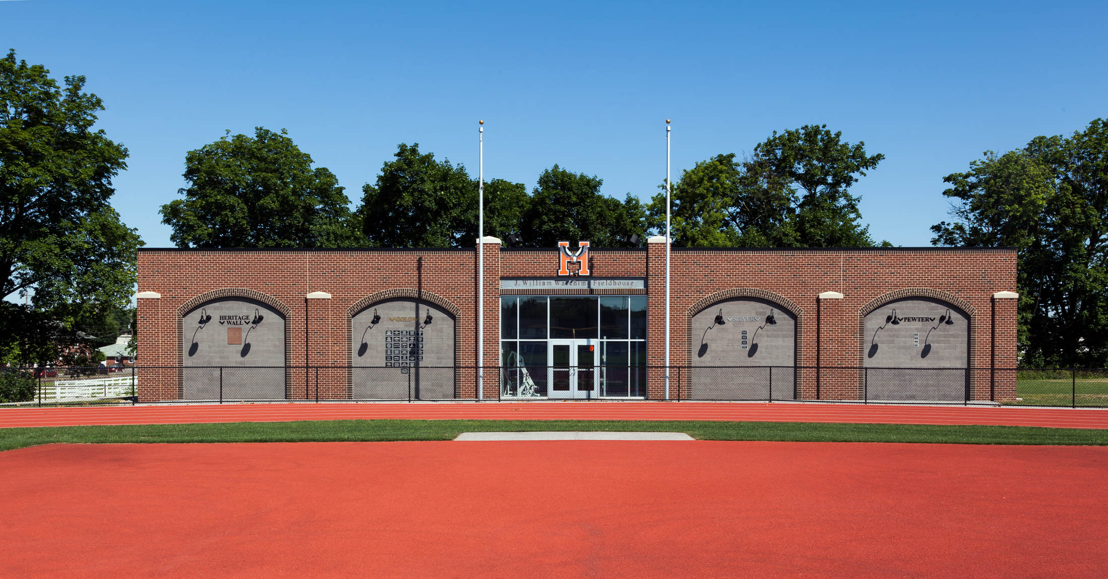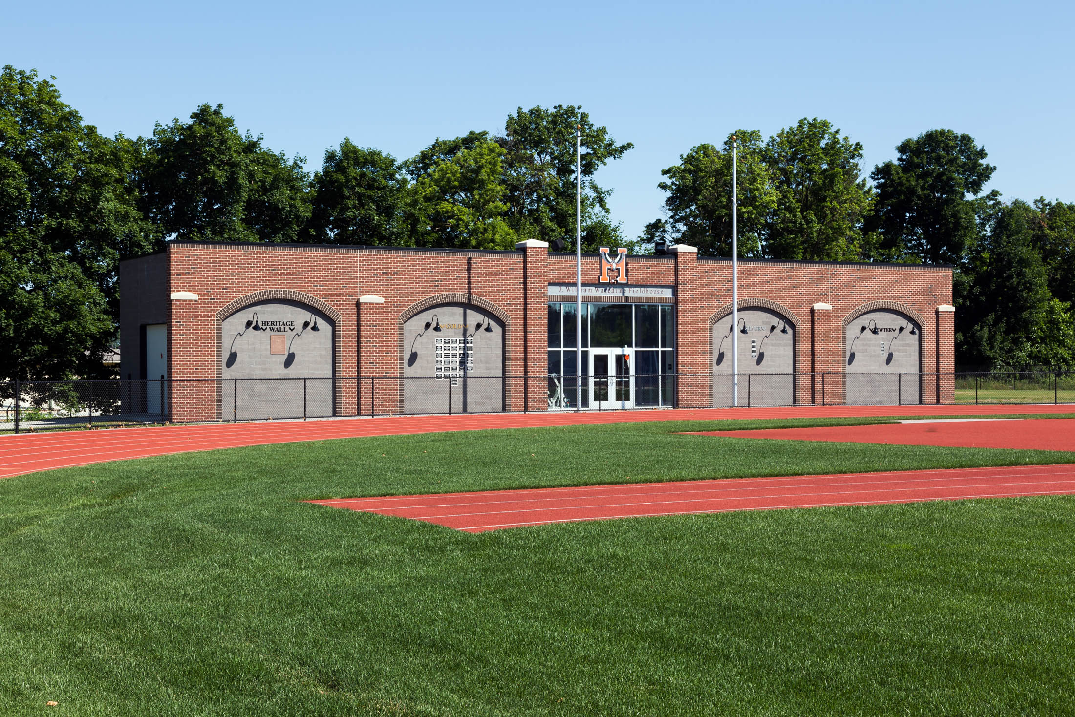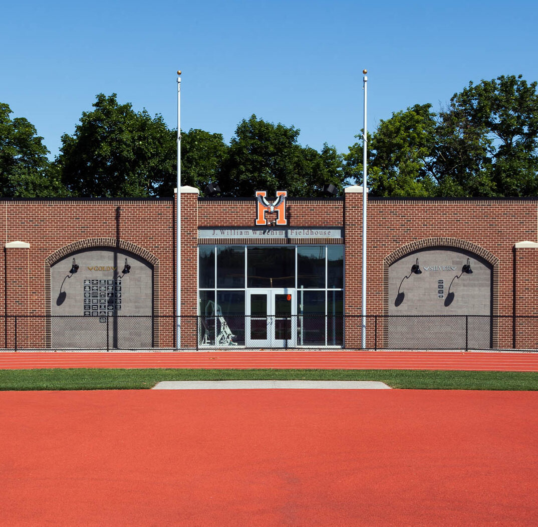 This new one-story field house is load bearing masonry with steel roof joists. Exterior finishes are colored CMU, brick veneer, pre-cast concrete pilaster caps, painted steel, storefront and a fully adhered EPDM roof system. The building includes a weight room, men and women’s restrooms, and storage.