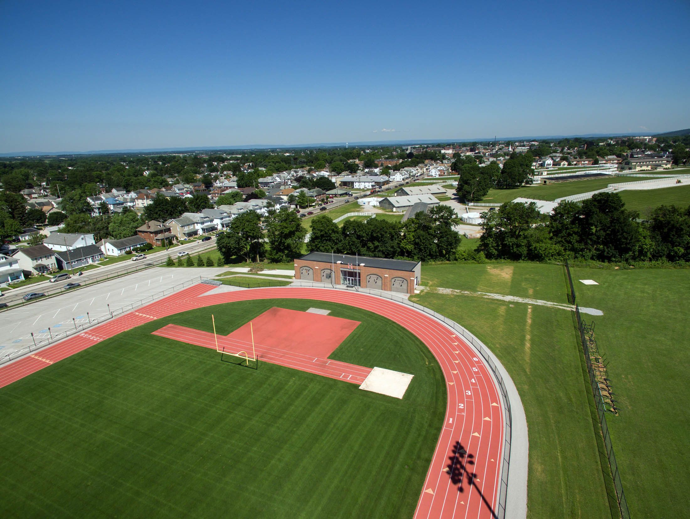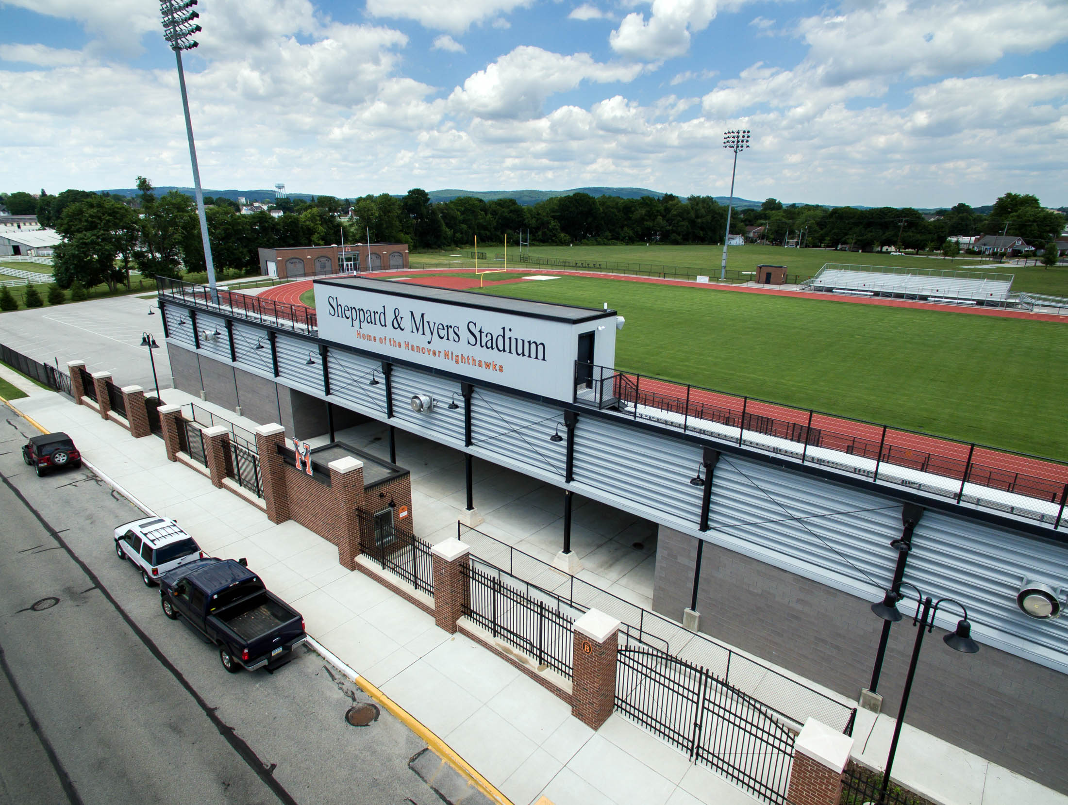 This renovation included the removal of bleachers and railings to accommodate the new handicapped accessible spectator areas, wider isles, and space to construct a new press box. The existing steel structure was painted and a new railing system was installed. The grandstands total 12,800 SF and seat 3,000